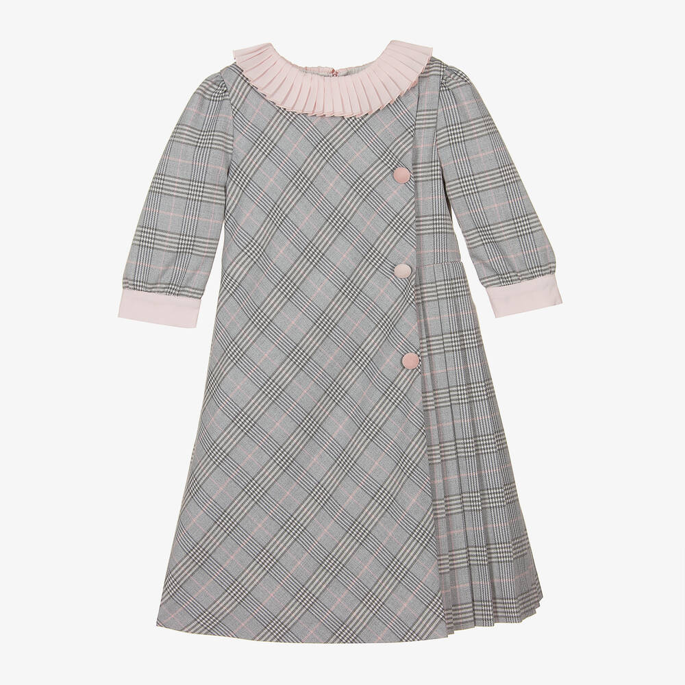 Smart pale grey and pink tartan dress for girls by luxury Portuguese brand Piccola Speranza. Made in soft twill with a touch of viscose, it has a pleated pink crêpe collar and matching cuffs on the puffed, three-quarter length sleeves. It is designed in a cross-over style, with decorative pink velvet buttons and pleats on one side and around the back. It has a full cotton voile lining for comfort and fastens with a neat concealed zip on the back.