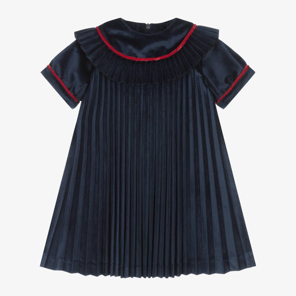 A charming, navy blue pleated dress for girls by Piccola Speranza, made in beautifully soft velvet with a flared silhouette. Designed with puffed, short sleeves, it has a pleated ruffle around the neckline and contrasting navy blue velvet trims. Lined in lightweight cotton for comfort, it fastens with a neat, concealed zip on the back.