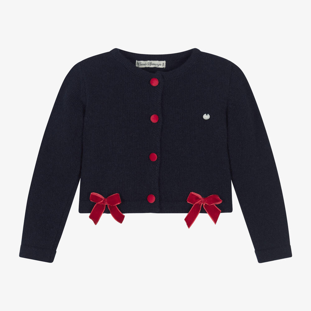 A smart navy blue cardigan for girls by Portuguese designer Piccola Speranza, knitted in a soft and cosy wool-rich blend. For a stylish contrast, it has covered buttons and bows on the front, all in beautiful red velvet. There is a pretty mother-of-pearl logo charm sewn on the chest.