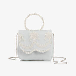 From Piccola Speranza, this pale blue handbag for girls is made in structured fabric and covered with a pretty embroidered lace. There is a delightful faux pearl top handle and a detachable clip-on silver chain shoulder strap for an alternative look.