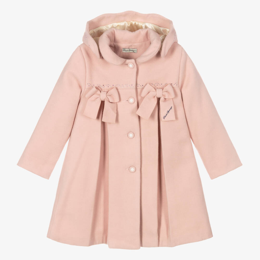 Lovely pale pink coat for younger girls by Piccola Speranza. It has two fixed bows with a navy blue logo print on one, and sparkly diamanté detail across the front and on the removable hood. For a beautifully flared, classic silhouette, there are box pleats on the front and back. Fastening with white and pink covered buttons, it is fully lined for comfort.