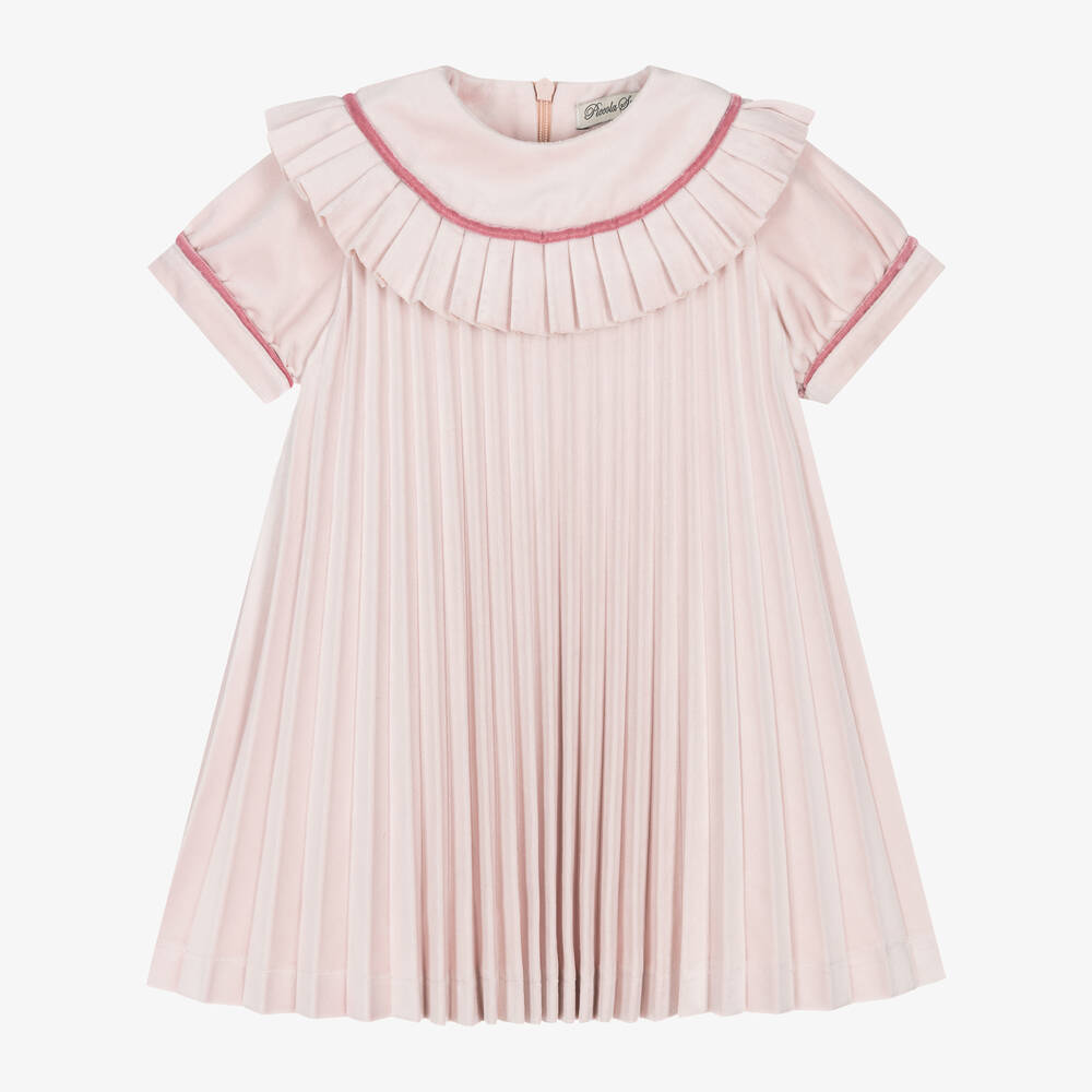 A charming, pink pleated dress for girls by Piccola Speranza, made in beautifully soft velvet with a flared silhouette. Designed with puffed, short sleeves, it has a pleated ruffle around the neckline and contrasting pink velvet trims. Lined in lightweight cotton for comfort, it fastens with a neat, concealed zip on the back.