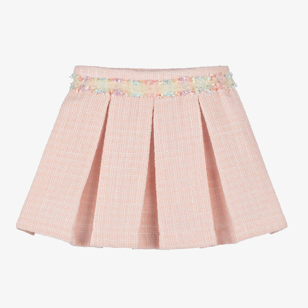 A stylish pink skirt for girls by Piccola Speranza, made from soft, mid-weight tweed. In a pleated design, this pretty skirt is decorated around the waist with delicate satin ribbons in beautiful pastel shades. It has a lightweight cotton lining for comfort, with a concealed zip and button fastening on one side and an adjustable waistband to ensure a great fit.
