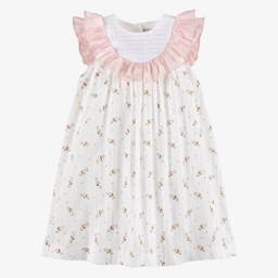 A bright red dress for girls by luxury Portuguese brand Piccola Speranza, made from soft and floaty crêpe. It has a beautiful floral pattern with a charming ruffle collar and deep frill at the hem. Lined in lightweight cotton for comfort, it has a dramatic trapeze silhouette and a keyhole button fastening on the back of the neckline.