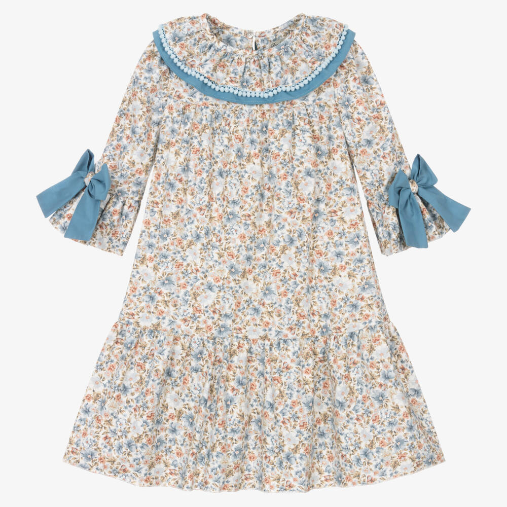 Gorgeous blue and white cotton twill dress for girls, by Piccola Speranza, with an all-over vintage floral print. Styled with a layered ruffle collar and pale blue pom-pom trim, the dress is gathered from the bodice for a flared fit and has a pretty ruffled hem. The shorter length sleeves have flared ruffle cuffs with large bow trims to complete the look. Lined with lightweight cotton for comfort, the dress has a stylish keyhole button fastening on the back.