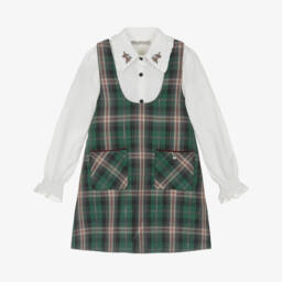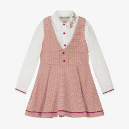 A beautiful white tiered dress set for girls by Piccola Speranza, with blue striped and heart print panels. Made in a soft cotton blend with a fine textured weave, it has a rounded collar and short, puffed sleeves for a classic look. A concealed zip fastens neatly on the back and the dress comes with a small matching bag, trimmed with navy blue satin ribbon.