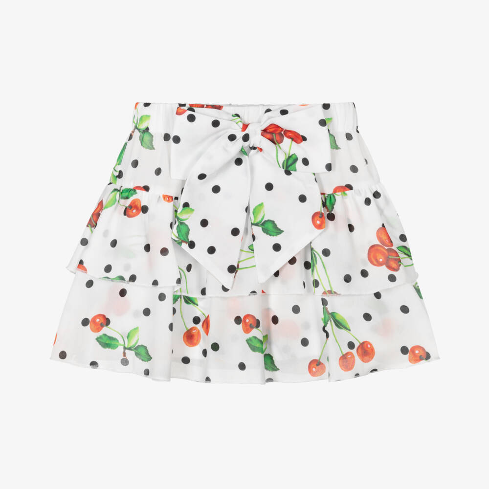 Gorgeous white skort for girls by Piccola Speranza, made in soft and lightweight chiffon. This fun skort is patterned with black polka dots and red cherries. The tiered top layer has gathered detailing and a fixed bow, for a dramatic statement finish.
