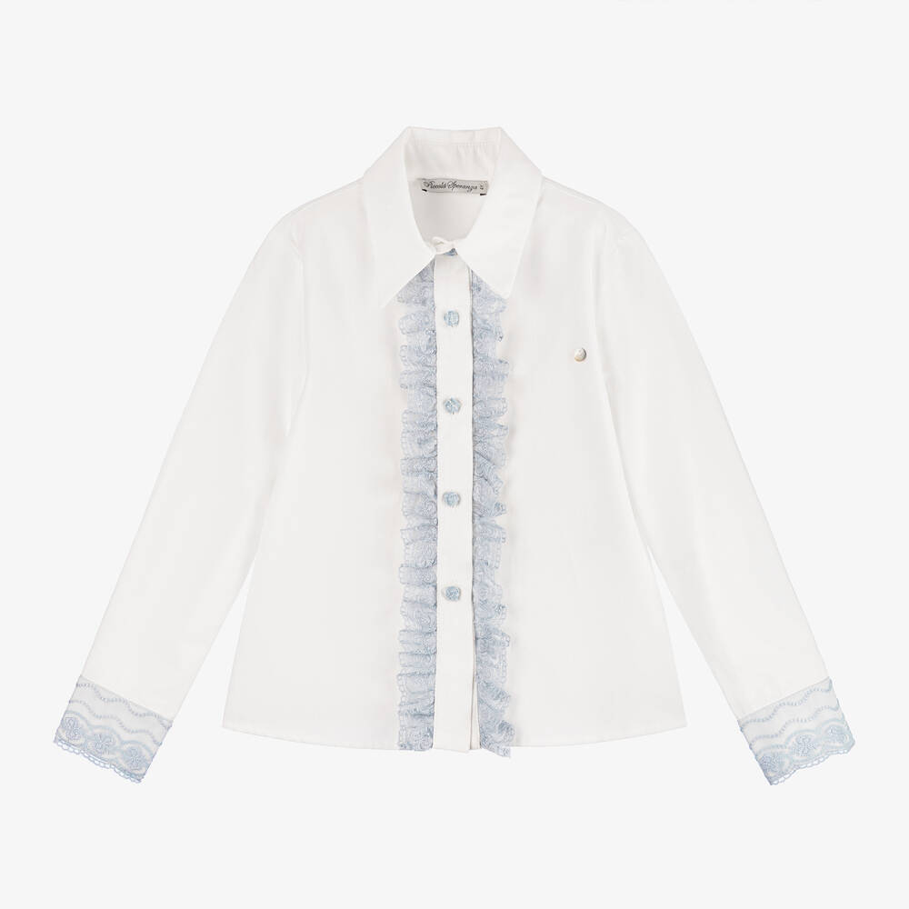 A white blouse for girls by Piccola Speranza, made in soft cotton, with a slight brushed feel. Ideal for those smarter occasions, this classic long-sleeved style is decorated with a pretty blue lace ruffle on either side of the tweed-covered button fastenings. Matching lace trims the cuffs and for designer appeal, a small mother-of-pearl logo charm is stitched on the chest.