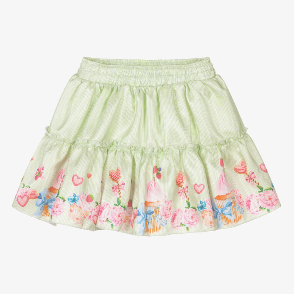 Pretty and feminine for girls, this finely striped green skirt is by Piccola Speranza. Made in silky satin, it is patterned in a gorgeous print of pink flowers, hearts, bows and cupcakes. There is a lightweight cotton lining for comfort, with an elasticated waist for easy pull on.