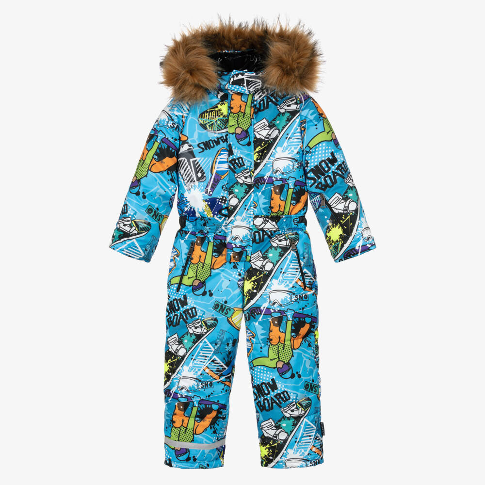 From Pilguni, a bright blue snowsuit for boys with a fun, colourful snowboard print and detachable beige faux fur trim. Made in smooth polyester with a cosy fleece lining, it is warmly padded with Isosoft™ technical performance insulation. Inner ribbed cuffs, gaiters inside the ankles, and a drawstring on the detachable hood help to keep the warmth in. This one-piece snowsuit fastens with a zip beneath a popper placket, with useful zip-up hip pockets and a zipped ski pass pocket on one sleeve. For improved visibility in poor conditions, there is a reflective strip on one ankle.