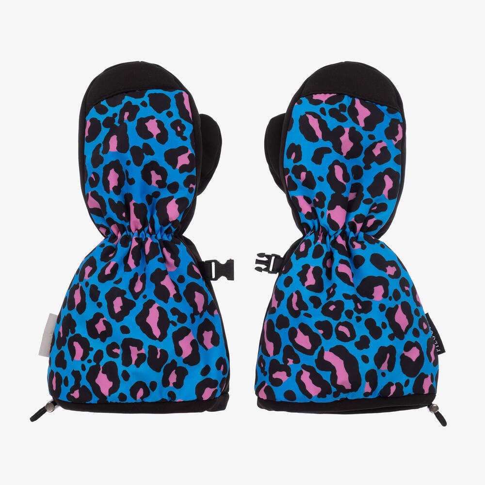 Bright blue ski mittens for girls by Pilguni, with a pink and black leopard print. Made in silky smooth waterproof and windproof fabric, they provide optimum protection on the slopes and beyond. Warmly padded, they have a cosy polar fleece lining, carabiners to clip the mittens together and an adjustable drawstring at the wrists to keep out the wind and snow.