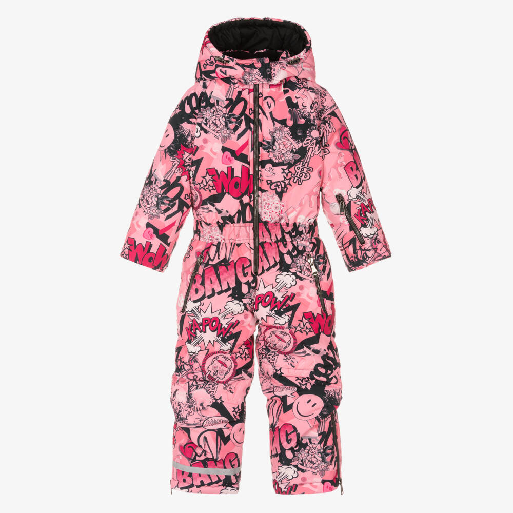 Cool pink snowsuit for girls by Pilguni, padded with Isosoft® insulation for premium protection on super cold days. Patterned with a fun cartoon design all-over, this stand-out one-piece allows you to make a statement on the slopes, whilst having reflective trims for extra safe visibility. Lined with warm and cosy polar fleece, it fastens securely with a front zip with a storm placket to keep out the snow. Reinforced with knee patches designed for wear and tear, it has internal cuffs on the sleeves and gaiters on the ankles to keep your child extra dry on the slopes. There are zip fastenings on the legs to make room for a chunky ski boot and the detachable hood adds a versatile twist. It also has a useful ski pass pocket and a elasticated waist for added warmth and style.