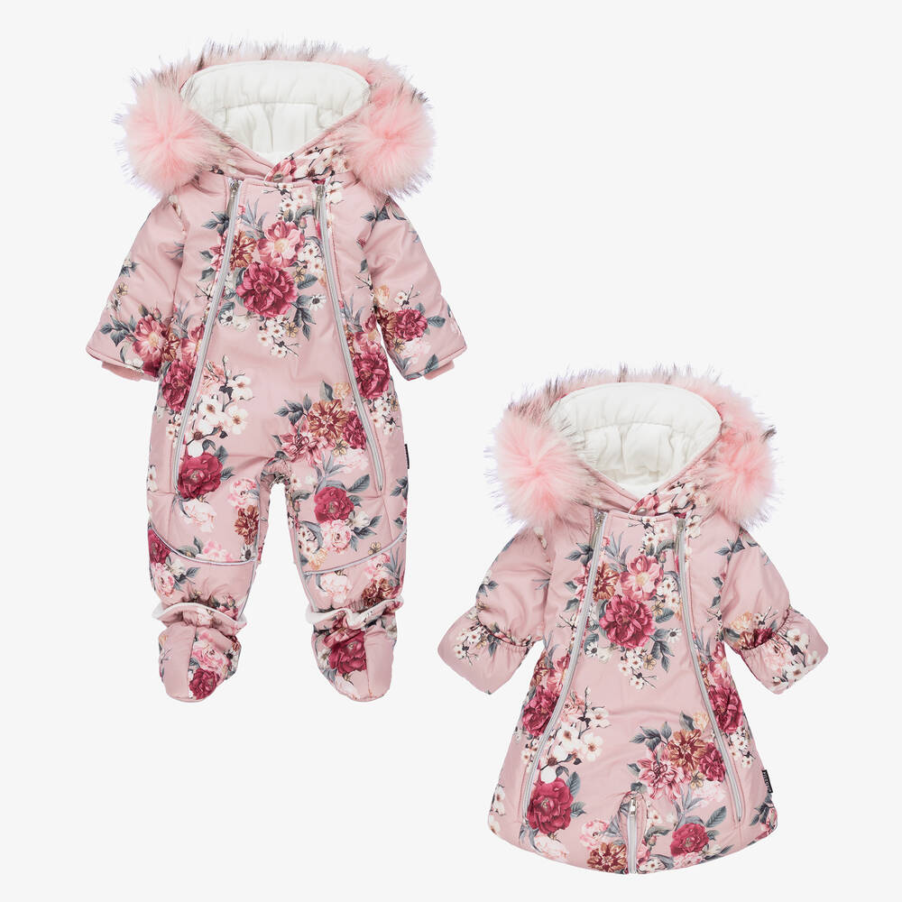 Baby girls will stay warm and dry in this pink, ivory and green floral print snowsuit by Polish brand Pilguni. Silky smooth on the outside, it has a soft jersey lining and is padded with Isosoft™ technical performance insulation for superior comfort and warmth. It has a fixed hood, with a detachable pink faux fur trim. There are ribbed sleeve cuffs and elasticated leg openings, with detachable booties and fold-over mittens for added protection against the elements. This one-piece snowsuit is elasticated at the back, and has two zip fastening down the front, with another zip between the legs.