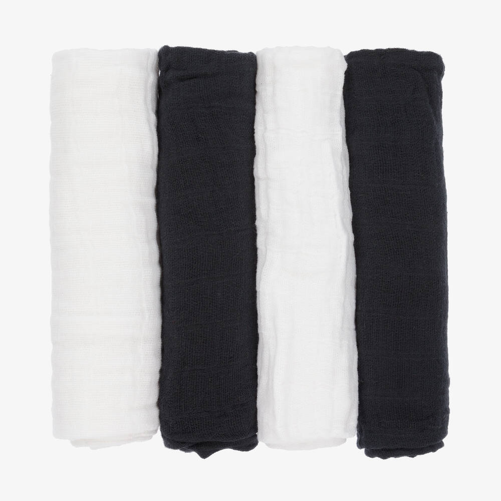 A four-pack of navy blue and white muslin cloths for baby boys and girls by Pippi, made from delicate and breathable organic cotton. They are practical for use as a swaddle blanket to keep your little one wrapped up, or as a burp cloth to clean up spillages.