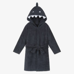 A fun, dark blue-grey hooded bathrobe for little boys and girls by Pippi, made in soft, absorbent cotton towelling. Great for keeping cosy after bathtime, it features a playful shark design on the hood, with embroidered eyes and appliqué teeth. There is a popper fastening at the neckline and a removable tie belt around the waist.