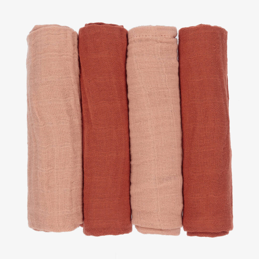 A four-pack of pink and terracotta red muslin cloths for baby girls by Pippi, made from delicate and breathable organic cotton. They are practical for use as a swaddle blanket to keep your little one wrapped up, or as a burp cloth to clean up spillages.