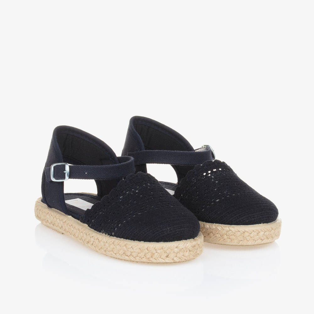 Lovely for the warmer weather, these navy blue espadrilles for girls are by Pisamonas. Made and lined in a smooth weave, they have openwork detailing on the toes with a sweet scalloped edge. Designed with open heels, there is a canvas panel and narrow strap around the ankle that fastens neatly with a silver buckle. They have lightly padded insoles for extra comfort, beige jute midsoles for a stylish finish, and slim non-slip rubber outsoles for better grip.