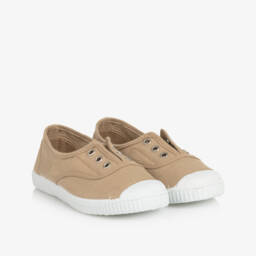 Green slip-on trainers for boys and girls by Pisamonas, ideal for warm weather wear. Made in durable canvas, they have an easy, slip-on in style, with an elasticated strip across the foot, whilst the sturdy, non-slip white rubber sole ensures comfort and durability.