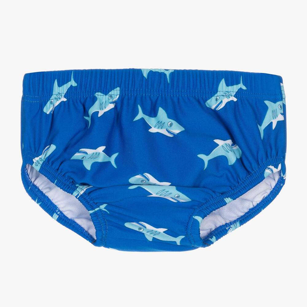 Bright blue shark print swim pants for baby boys by Playshoes, with UPF 50+. Stretchy and silky, they have a soft jersey lining and an internal drawstring to ensure they fit comfortably over a swim nappy. The waist is elasticated for easy dressing and changing.