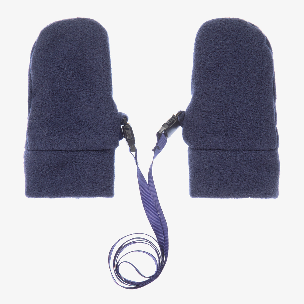 Little girls and boys navy blue mittens from Playshoes, made in soft anti-piling fleece. They are lightweight and breathable, with a ribbed insert and velcro fastening cuffs. They have a grosgrain ribbon that attaches to the gloves with plastic clips on the sides.