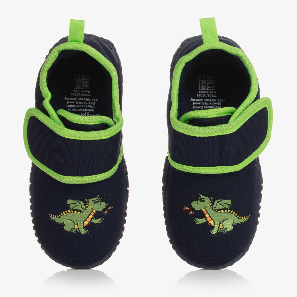 Blue canvas slippers for boys and girls from Playshoes. They have bright green trim and logo embroidery on the heel, and fun green dragon embroidery on the toe. They have a soft felted lining, non-slip rubber soles, and fasten with a velcro strap.