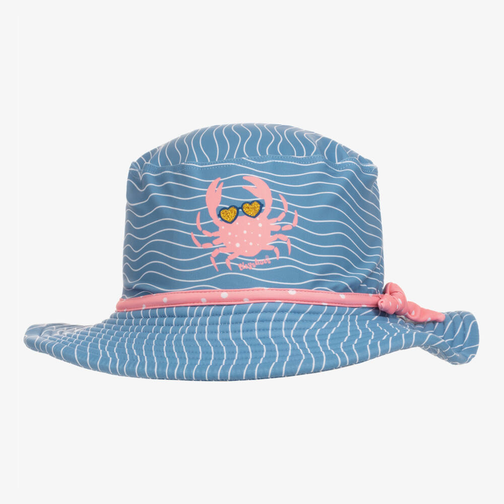 A blue and white striped sun hat for girls by Playshoes, with UPF50+. Silky, soft and stretchy, it has a pink and white polka dot trim and a crab motif on the front, accented with gold glitter.