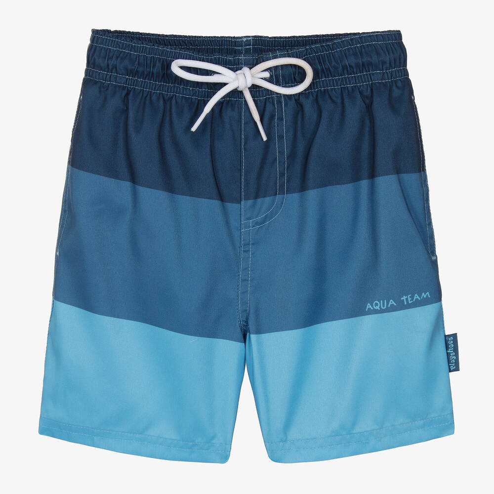 A pair of blue colourblock striped swim shorts for boys by Playshoes, made from recycled fabric with UPF40+. To allow extra comfort, they have a soft mesh lining, an elasticated waist with an adjustable drawstring and useful eyelets on the back. There are side seam pockets, 'Aqua Team' print on the front and a logo tab on the side.