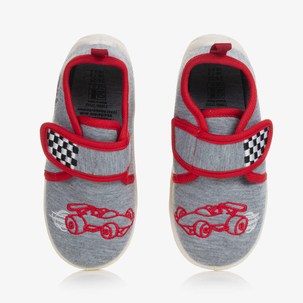 Grey marl jersey slippers for boys by Playshoes. They have bright red trim and grey logo embroidery on the heel, and fun race car embroidery on the toe. They have a soft jersey lining and non-slip rubber soles. They fasten with a velcro strap embroidered with a checkered flag.