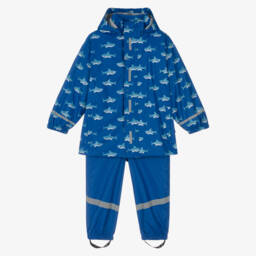 This bright blue raincoat and salopettes set by Playshoes is ideal for boys who love outdoor adventures. Both pieces are made in smooth, durable, waterproof fabric, with reflective detailing for added safety. The coat has a fun shark pattern in contrasting blue, with a detachable, mesh-lined hood and a popper-fastening flap over the zip for extra protection against the weather. The trousers have adjustable braces, side poppers and detachable, elasticated stirrups to ensure a snug fit.