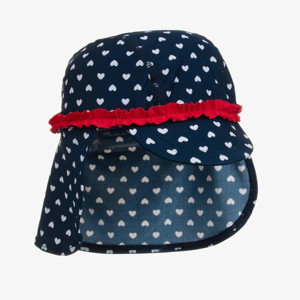 Girls navy blue Legionnaire-style swim hat by Playshoes, with UPF 50+ protection against the sun's harmful rays. Made in stretchy lycra with a white and red heart-print pattern and a pretty red trim, it is ideal for wearing in the pool. This sweet hat covers the ears and the back of the neck and has a peaked front to protect the eyes.