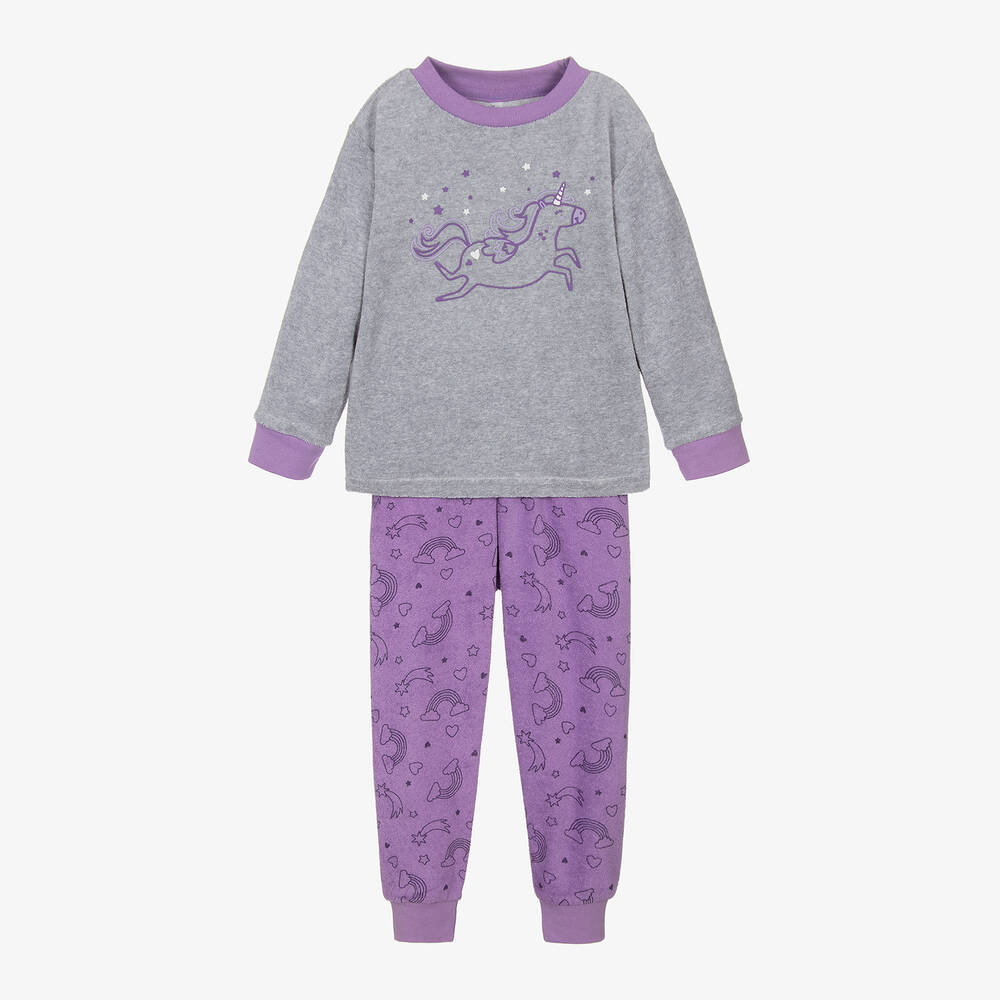 Purple and grey long pyjamas for girls by German brand Playshoes, with a fun unicorn theme. Great for sleeping or lounging, they are made in a soft and lightweight cotton-blend towelling. They have stretchy ribbed cuffs for a snug fit, with a gently elasticated waist for added comfort.