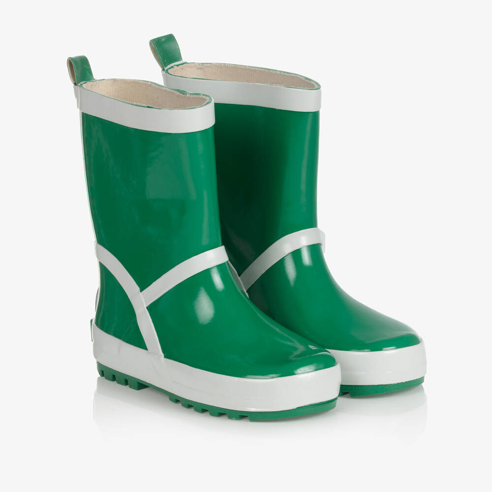 Green rain boots for girls and boys by Playshoes, made from flexible rubber. Lined in soft textile, they have a padded inner sole for comfort, and a silver reflective patch on the back for safety during evening walks.