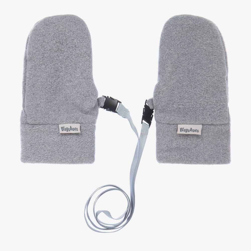 Little girls and boys grey mittens from Playshoes, made in soft anti-piling fleece. They are lightweight and breathable, with a ribbed insert and velcro fastening cuffs. They have a grosgrain ribbon that attaches to the gloves with plastic clips on the sides.