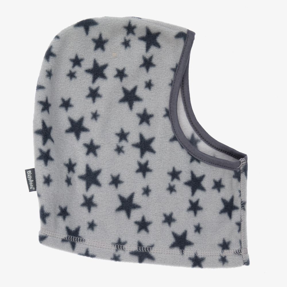 Grey star print balaclava for girls and boys by Playshoes. Warm and cosy for the cold weather, it is made in soft fleece with a jersey trim.