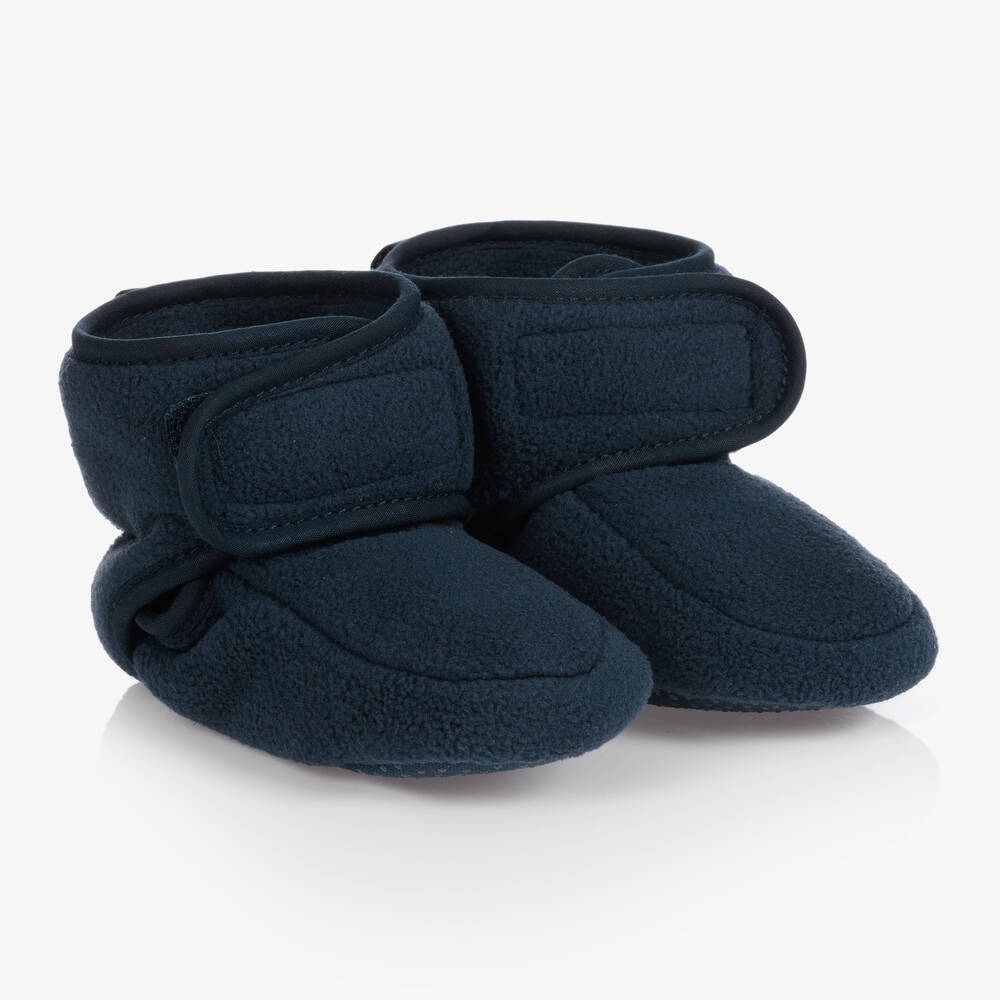 Navy blue booties for baby boys and girls by Playshoes. They are made in soft polar fleece on the inside and outside. Comfortable and easy to wear, they have double velcro fastenings with elasticated panels on the back to ensure they stay secured on little feet. The bottoms have tiny non-slip grips, making them ideal slippers or indoor boots.