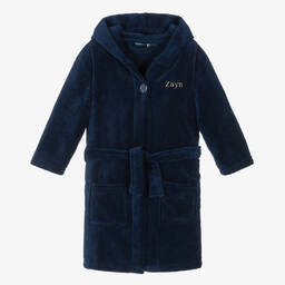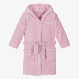 Hooded pink dressing gown for girls by Playshoes, made in soft, mid-weight fleece. It has two pockets on the front, a tie belt around the waist and fastens with a large button at the neck. The cosy and comfortable dressing gown can be personalised with your child’s name embroidered on the chest, making it a lovely choice for a unique and thoughtful gift.