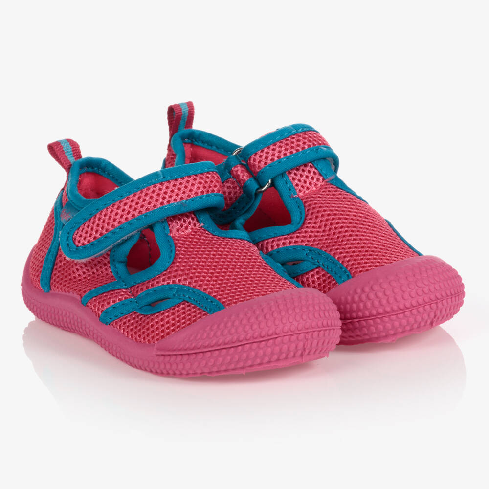 Girls bright pink and aqua blue beach shoes by Playshoes, made in soft, flexible mesh. With a slip-resistant rubber sole and a velcro strap fastening, these aqua shoes are comfortable for wearing on the beach or in and around the swimming pool.