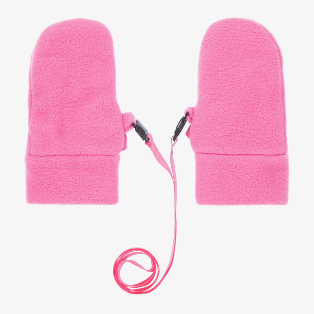 Little girls fuchsia pink mittens from Playshoes, made in soft anti-piling fleece. They are lightweight and breathable, with a ribbed insert and velcro fastening cuffs. They have a grosgrain ribbon that attaches to the gloves with plastic clips on the sides.