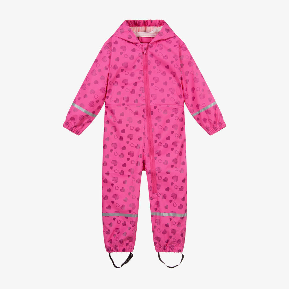 Designed by Playshoes for girls, a fuchsia pink rain suit made from soft smooth polyester. Wind and waterproof, this fun suit has a purple hearts print, light reflective trims and a large hood. It has removable elasticated straps on the hem and stretchy elasticated edges.