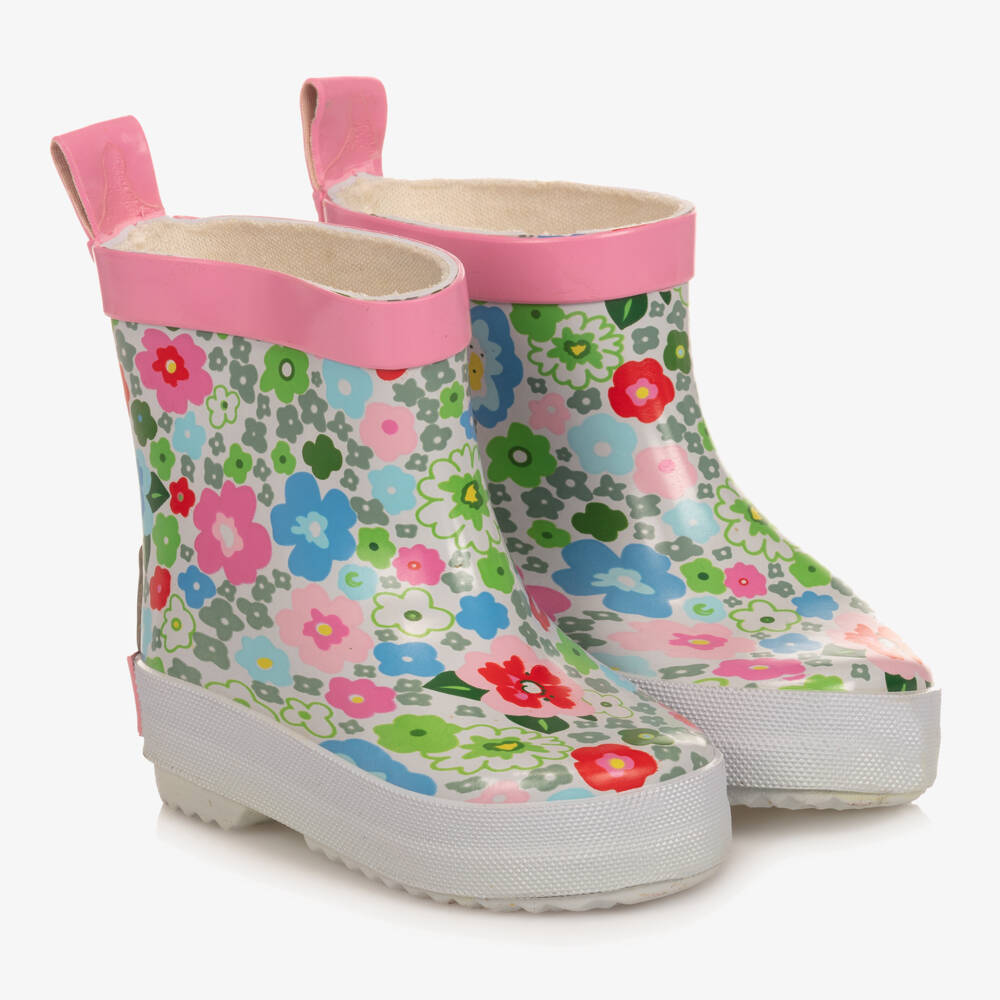 White rain boots for girls by Playshoes, with a pink, green and blue floral print. Made from flexible rubber, they have a soft jersey lining and chunky non-slip sole. The brand's logo is on the heel, along with a reflective silver patch.