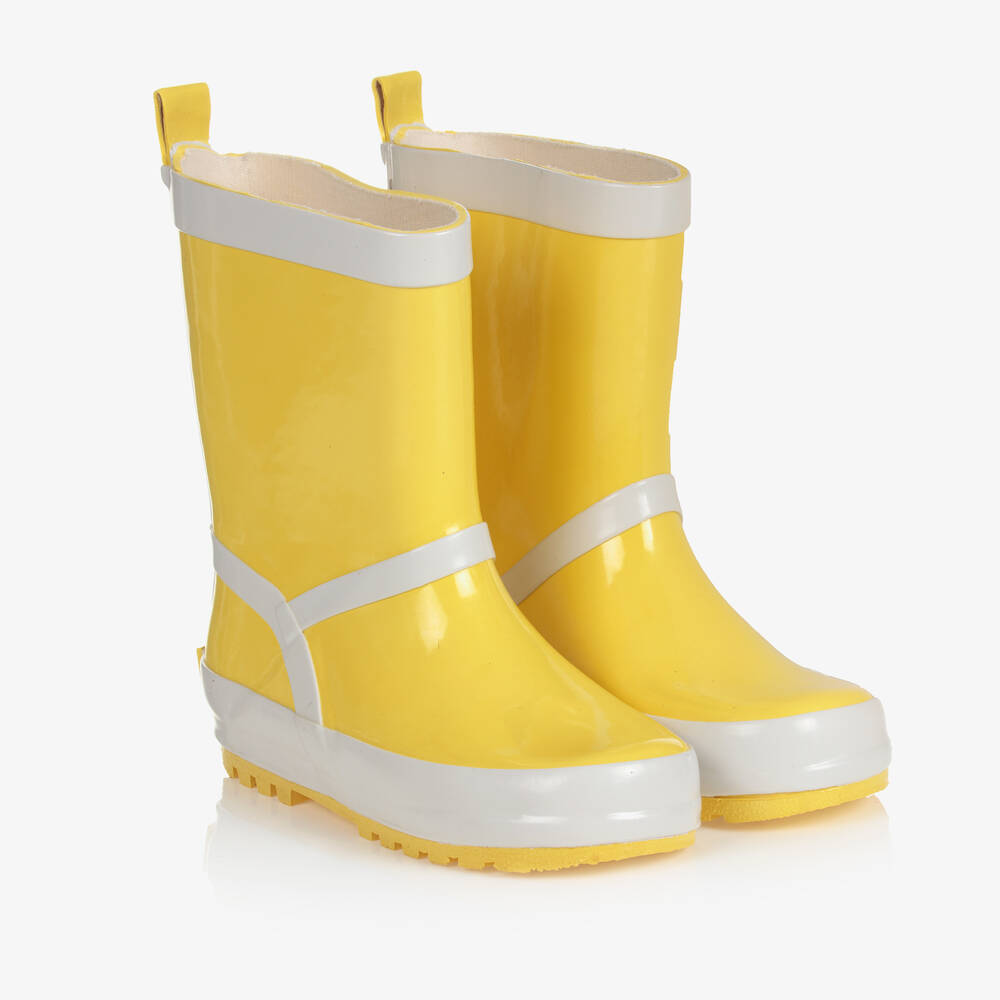Yellow rain boots for girls and boys by Playshoes, made from flexible rubber. Lined in soft textile, they have a padded inner sole for comfort, and a silver reflective patch on the back for safety during evening walks.