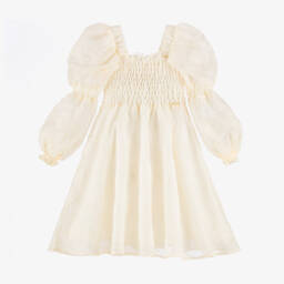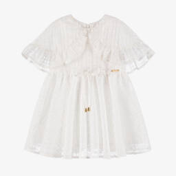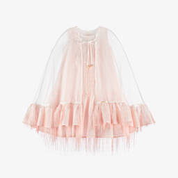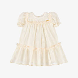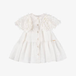 Beautiful ivory special occasion dress for girls by POCA & POCA. Made in matelassé fabric with a stylish bubble texture, it has a tiered silhouette and is luxuriously lined in a soft cotton blend. The flutter sleeves are shaped by gathered layers of pastel pink tulle and add a statement touch to the look. A seamless zip fastens the back.