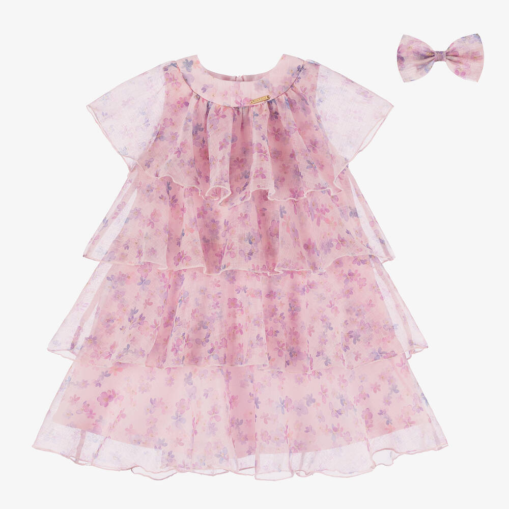 A pretty pink dress for younger girls by POCA & POCA, made in soft and lightweight chiffon fabric. This lovely layered design is patterned with flowers in muted shades of pink, blue and purple. It has a comfortable cotton-blend lining and a light, sheer top layer that covers each shoulder. The dress comes with a matching bow hair clip for an extra special touch.
