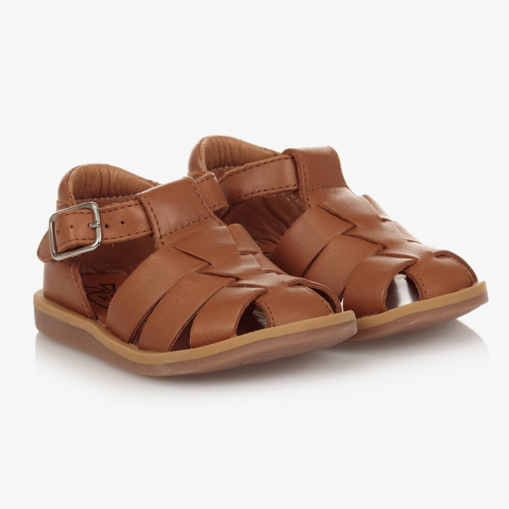 Boys brown sandals from French designer Pom d'Api, made in soft leather. There are straps across the foot and a padded heel for added comfort and support. The inner soles and lining are in leather and they have flexible, non-slip rubber outer soles. There is an adjustable buckle fastening strap across the ankle.