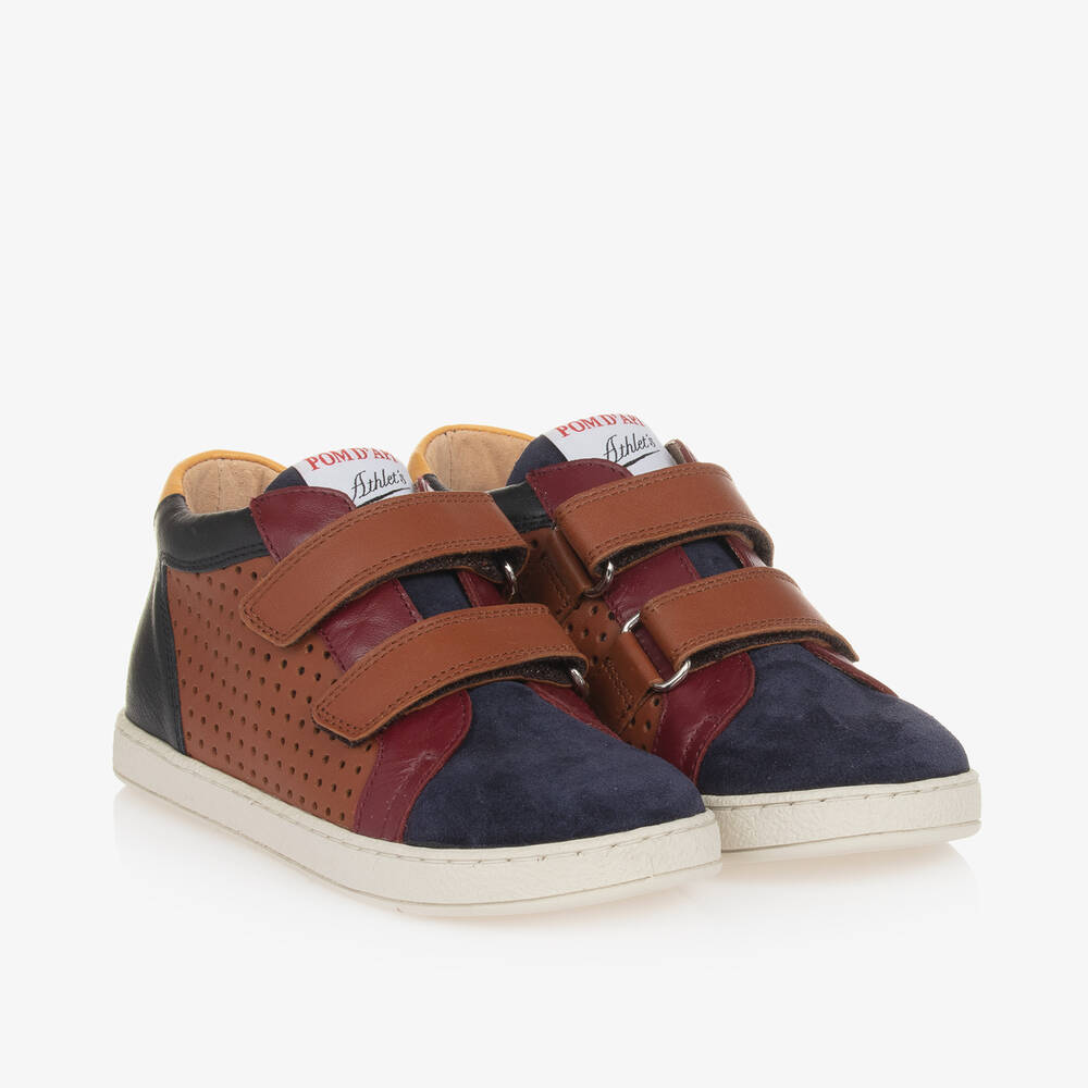 Brown and navy blue trainers for boys by Pom d'Api, made in smooth leather with a suede leather panel on the toe. Trimmed with burgundy red and yellow for an extra pop of colour, they have perforated sides and a logo badge on the tongue. They are lined in soft leather, with a removable, lightly padded insole and non-slip rubber outer sole for good grip. To ensure a comfortable fit and allow the proper development of the foot, they fasten easily with two velcro straps.