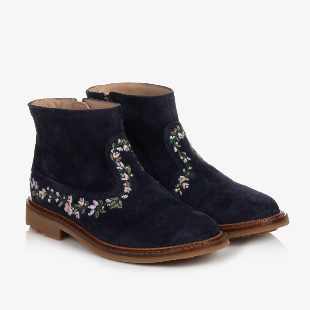 Gorgeous navy blue suede boots for girls by Pom d'Api, with pink flowers embroidered around each shoe. They have a side zip and velcro fastening, a smooth leather lining and a grippy rubber outsole.