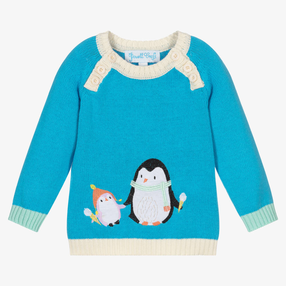 An adorable blue sweater for baby boys and girls from Powell Craft, knitted from super soft cotton yarn. It has a cute appliqué penguin and baby with embroidery on the front, ribbed ivory and aqua blue trims and smart ivory buttons to fasten on the front.