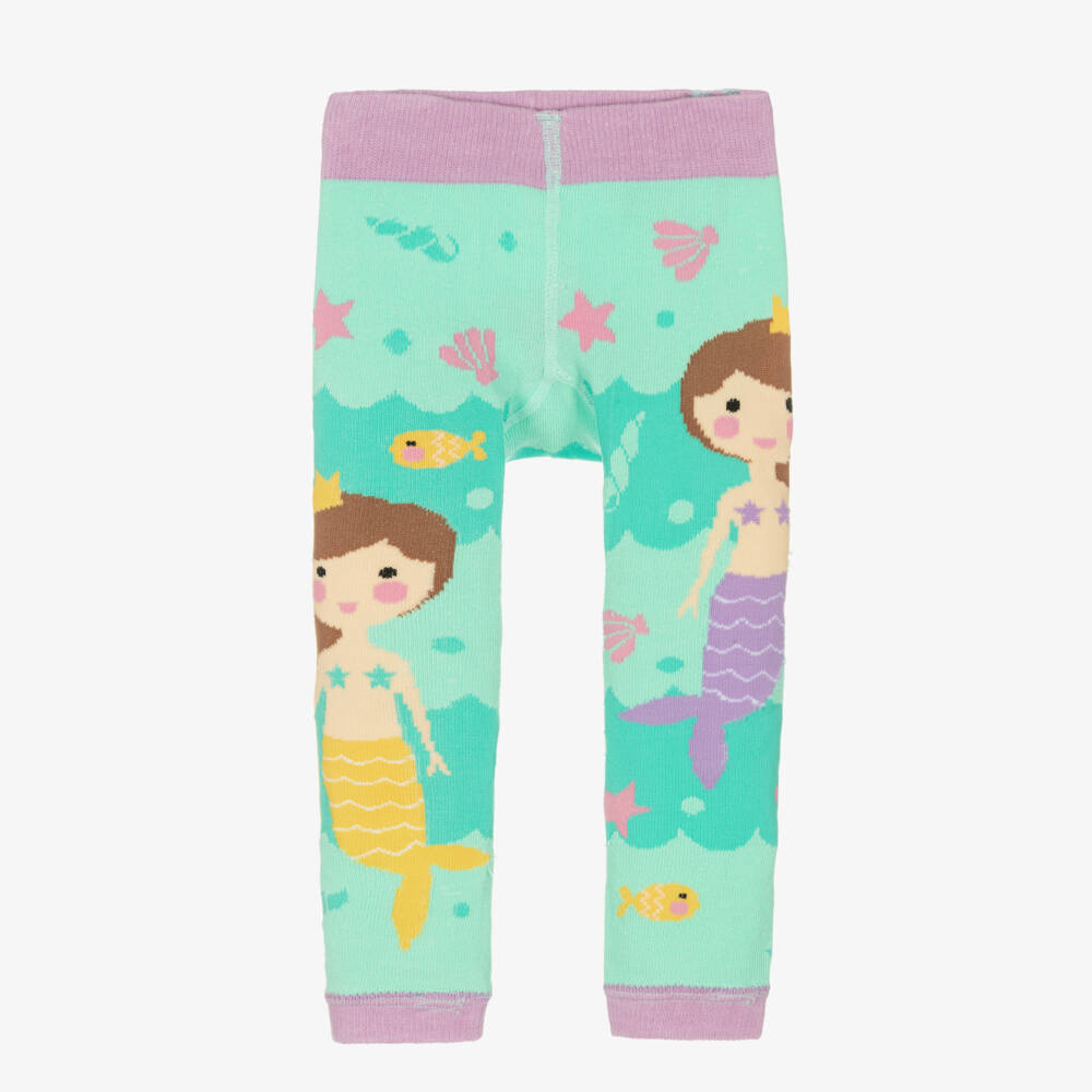 Green and lilac leggings for little girls by Powell Craft, patterned with mermaids and sea creatures. Soft and stretchy, they can also be worn as footless tights.
