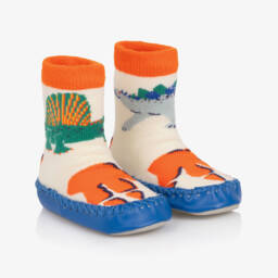 White and pink moccasin slipper socks for younger girls from Powell Craft. Great for keeping feet cosy, the base is made from non-slip faux leather and the cotton-rich socks are patterned with a pretty pink and red butterfly motif.