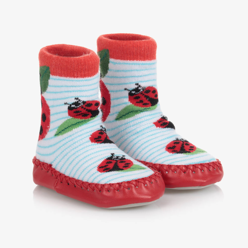 Red moccasin slipper socks for younger girls from Powell Craft. Great for keeping feet cosy, the base is made from non-slip faux leather and the cotton-rich socks are striped in white and blue, with a cute red ladybird motif.